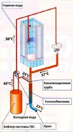 Так как горячая вода не успевает остыть во время её использования и стекает в канализацию горячей, то это неоправданные потери тепла. Чтобы их снизить, на точки расхода воды устанавливается система рекуперации. Она представляет собой теплообменник, часто выполненный в виде змеевика, устанавливаемый на канализационную трубу. Стекающая горячая вода нагревает окружающую среду и как следствие теплообменник. К этому теплообменнику подключена холодная вода из водопровода, которая затем попадает в бойлер.