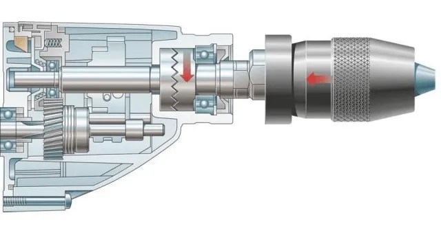 Как можно заметить на иллюстрации, удары дрели обеспечивают толчки храповых колес. Чтобы эти удары при сверлении в твердых материалах как-то проявляли себя, требуется к инструменту прикладывать усилие около 15 кг.
