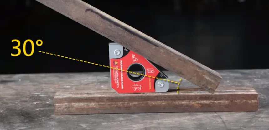 Внутри этих угольников установлены мощные неодимовые магниты. Благодаря силе этих магнитов и форме угольника, свариваемые элементы можно устанавливать под углом 90°, 60°, 45° и 30°.